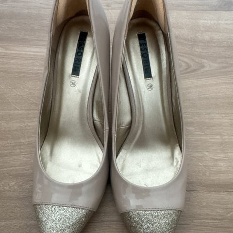 Pene, beige sko med glitrende pynt og lav hæl fra Tesori, ca 10 år gamle. Størrelse 39.