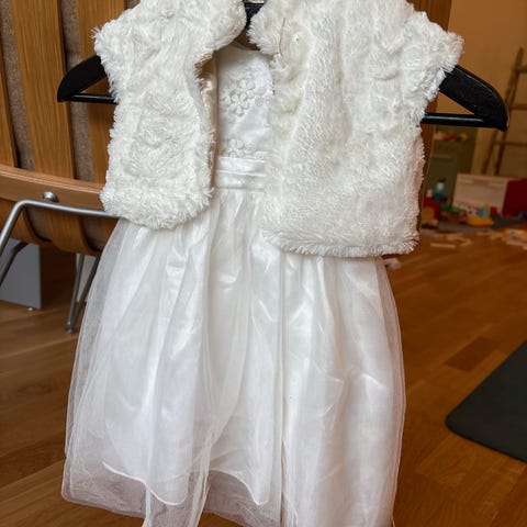 Vest og slips fra Agape i str 1 år. Ingen bruksanmerkninger, men sydd litt inn i siden av oss. Kan lett taes opp igjen. Hempe til å stramme til på ryggen.