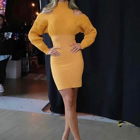 En flott aprikos kjole i mange lag og draperinger. Kjolen har en kledelig passform og faller fint.