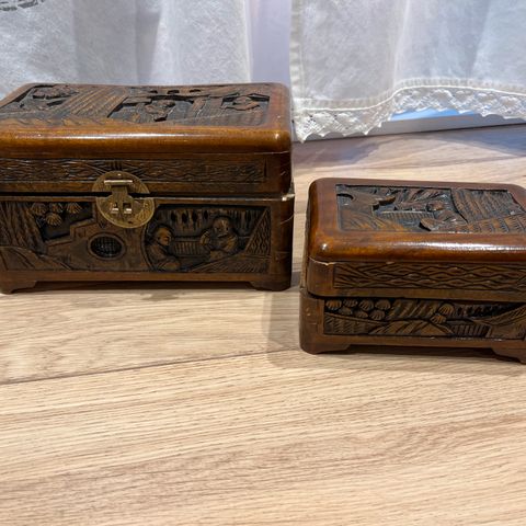 Pent kamfertreskrin størrelse 25. 5 lengde. Høyde 15 cm og bredde 14.. 5 cm. Selges kan sende med posten