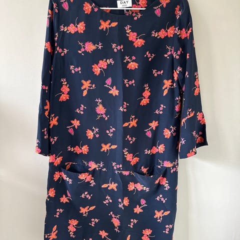 Svart/burgunder/vinrød, paisley mønster silkekjole/bluse. Trekvart ermer, knapp i nakken og avrundet hem. Skrår, blir smalere fra armhule til hem, noe som gjør den litt trangere over hoftene (på meg) og gir en litt posete effekt på overkropp. Svart kant på ermer. 100% silke