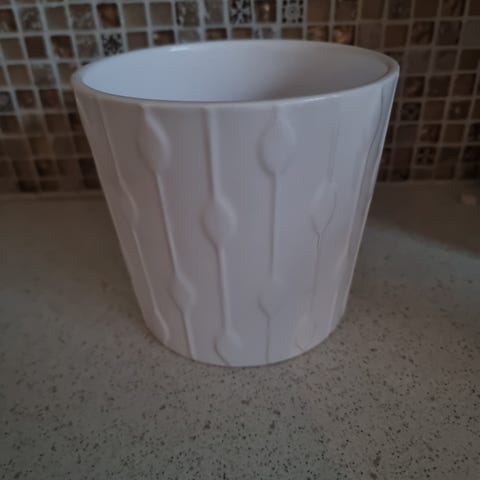 Selger pent brukt potteskjuler med horisontale riller. Hvit. Mål: se siste bildet.
