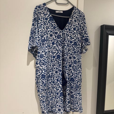 Mørk blå med sommerfugler motiv, knappestolpe i halsen , hentes her eller jeg sender