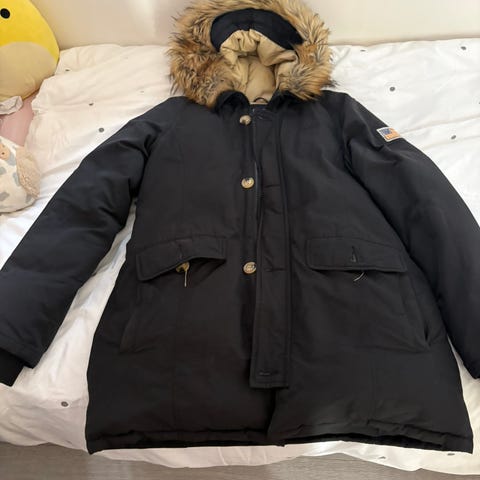 Jakken er ellers meget fint, ingen hull eller andre skader. Fuskepels på krage er med knapper så kan tas av. Glidelås og knapper og to ytterlommer. En innerlomme.