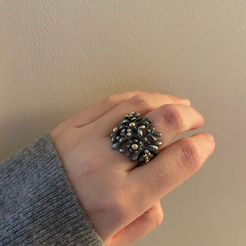 Ole Lyngaard - unik forest ring med vakre detaljer og organiske former. Denne ringen er laget av 925 kt sølv og 18 kt gull, prydet med rød korall og diamanter. størrelse 53-56. Ringen er designet som en åpen ring, og den kan enkelt tilpasses ved å forsiktig klemme i ringen,uten behov for gullsmed.