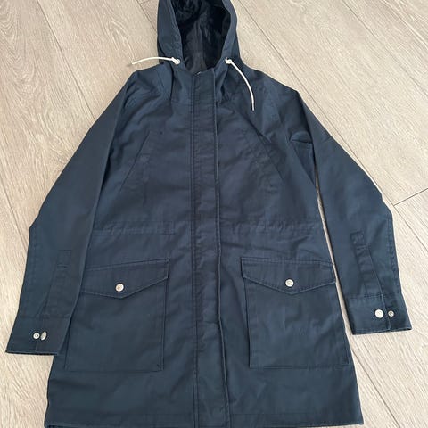 Sort lite brukt parkas vårjakke fra Zizzi. Stor og god hette med snøring. Lommer med knapp. Glidelås og knapper for lukking. Stramming i livet.