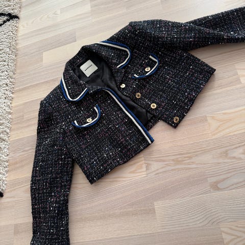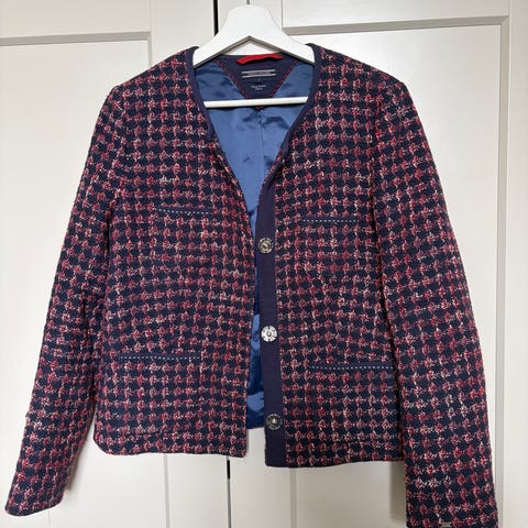 Tommy Hilfiger jakke selges. Blå- og rødmønstrete med sølv-trykknapper