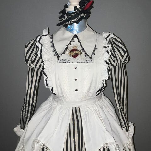 Lolita antrekk kjøpt på bodyline butikken i Harajuku i Tokyo for noen år siden. Jeg fikk ikke lov til å prøve klærne, derfor kjøpte jeg alt ganske stor for meg selv. Jeg er selv 1.73 og 70kg. Størrelsen er sikkert mellom 2XL-3XL, men kan justeres til L/XL. Lang nok i armene for meg. Brukte den lite og usikker over materialer.