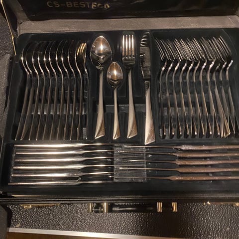 Bestikk av veldig god kvalitet av rustfri stål, i original pakking., til barn. Lengder: 18 cm x 15, 5 cm x 15,5 cm x 12,5 cm. Kan sendes