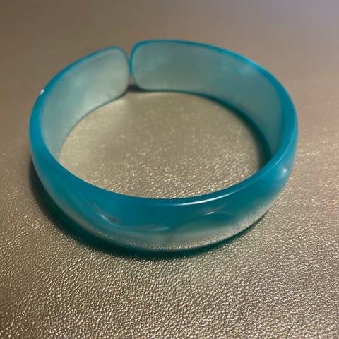 Håndlaget, sølvbelagt ørepynt av meksikansk turkis og innlagt perlemor. Turkisen har blitt knust og deretter satt sammen igjen. Sammen med perlemoren danner dette et vakkert og unikt smykke. Produsert i Taxco, Mexico. Ca. 6 cm fra toppen av kroken til bunn.