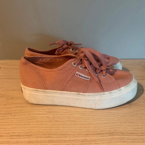 Superga i rosa og svart skinn er omtrent ikke brukt