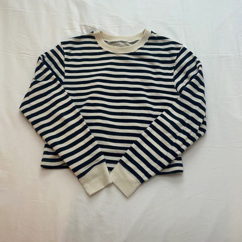 Stripene topp. 95 % bomull og 5 % lycra. Veldig behagelig å ha på