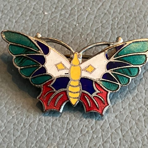 Alle meg glass eller krystaller. Sommerfuglen har matt emalje. Den med lilla farget glass er fra 1950tallet. Andre 2 er fra slutten av 1990tallet.