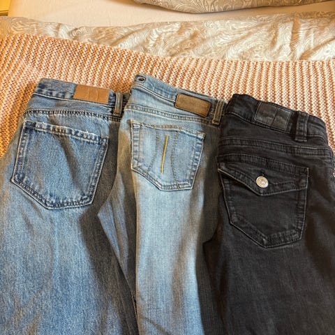 En dongeri fra Zara, en grønn fra I say, en blå fra Claire og en blå fra Cubus. Str varierer fra ca S-M / 36–38. Alle med smale ben. Selges samlet.