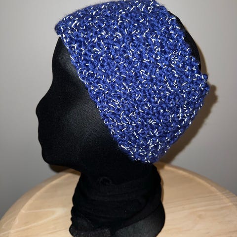Pannebånd håndstrikket, hjemmestrikket, garn «Mjuk Storm» tykk ull, denim