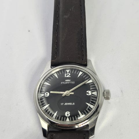 Case: Stainless steel back; case is approximately 37mm in diameter excluding the original signed Fortis winding crown.
