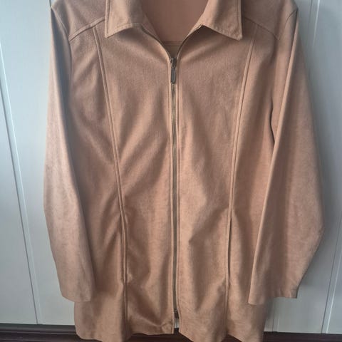Med krage, stikklommer og glidelås foran som går helt ned.