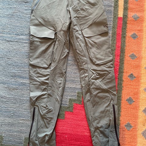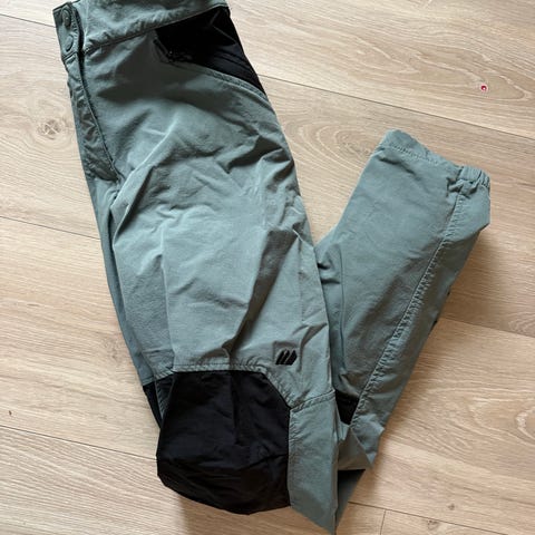 Stretch parti, forsterkede knær, lommer i front og på ene siden, glidelås nede på beina, borrelås lukking nede på beina,