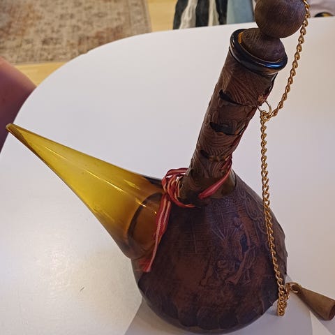 Spesiell dekorativ håndblåst spansk vinkaraffel/dekanter/Porrón/wine decanter/wine beaker til salgs! Gave/julegave til en vinelsker? Til deg selv?