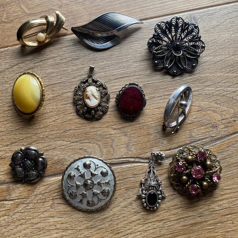 Den med slips er fra 1920 tallet og er allerede antikk. Jeg merket på bilde at en glass strass ble grå. Circa 2,5 -3 cm i diameter