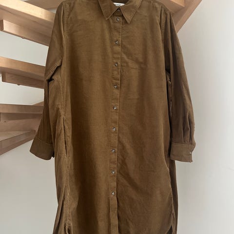 Klassisk og fantastisk kjole fra Selected femme. Kjøpte denne i beige og farget den med tekstilfarge (denne: https://www.jernia.no/praktisk-hjem/rengjøring-og-vaskeutstyr/tekstil--og-skopleie/tekstilfarge/herdins-tekstilfarge-723-olivengrønn-100ml/p/66013978) så nå er den olivengrønn og fantastisk fin!! Underkjole og skjortekjole med knyting over. Linblanding. Str 40.
