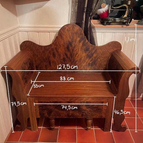 Benken er 194 cm lang med armlene, 63 cm dyp med rygg sitte høyde er 48 cm og høyde på rygg er 94 cm