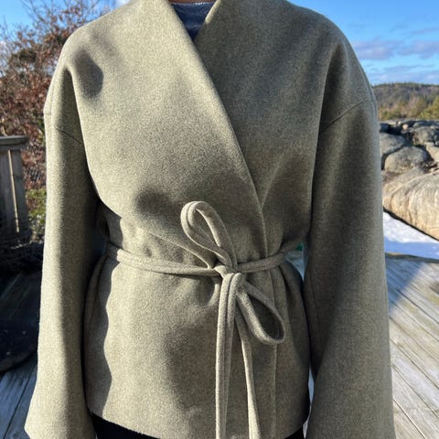 Klassisk omslags kåpe med belte, tidløs grå, kne lengde, lommer, pent brukt.