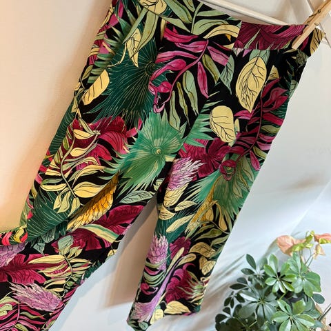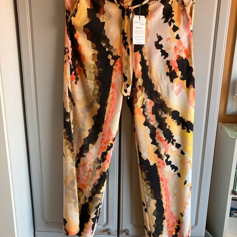 Silkeaktig stoff. Lett. Høy på livet med bånd.