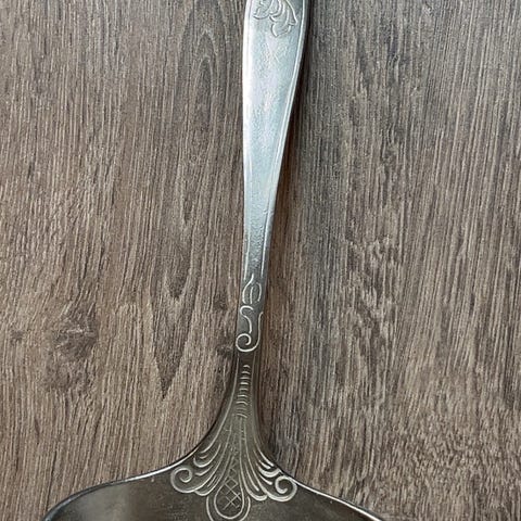 Antikk skje til servering. Er et anker som antagelig er et mestermerke og bokstavene DEP. Estimert årstall er rundt 1850 er meg fortalt. 35 cm lang. Kan sendes mot at kjøper betaler porto på 69.-