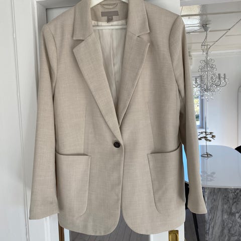 Superfin klassisk blazer i kamelfarge. Blazeren er pent brukt, og er størrelse L. Materiale: 73% polyester, 24% viskose, 3% elastan. Jeg sender stort sett alltid første virkedag etter mottatt penger for frakt :)