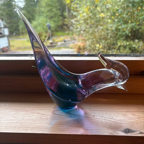 Den fargerike keramikkbollen har en morsom form, spesiellt med tanke på håndtakene. Det er vanskelig å tyde hva som står på undersiden.