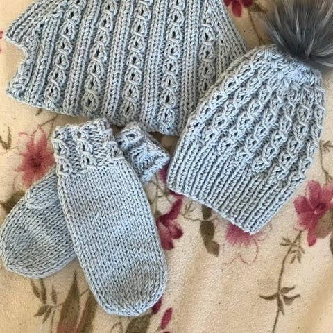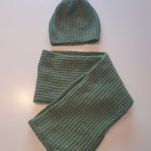 Selger sett med lue og hals. Strikket i alpakka og ønske garn (skimmer garn). Pent brukt,Selges som det er.