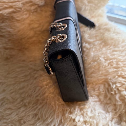 Fin liten veske med skulderrem og fløyelsstoff. Kan "justere" reimen ved å legge den dobbel..