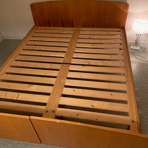 Solid og pen seng i teak med madrassmål 190x75 cm selges. Sengen er enkel å demontere. Sengebunnen er intakt. Selges uten madrass.