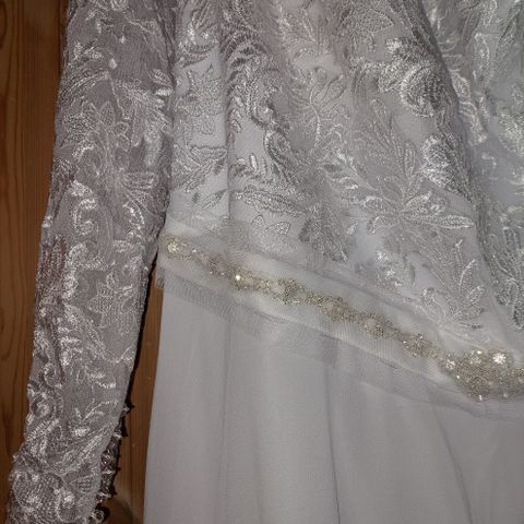 Nydelig brudekjole fra JJHouse. Den er sydd på mål, ca str 42 (romslig), men kan tas inn. Slepet er også forkortet, da jeg syntes det blei i meste laget. Er fortsatt slep, som faller fint. Det er isydd underskjørt, og på toppen av det hele har den lommer! (Perfekt for oppbevaring av leppestift og tale 😉) Kjolen er brukt en gang, og er nå klar for en ny brud❤️