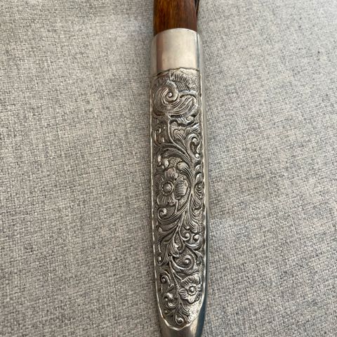 Har fått i oppdrag å legge ut denne litt større enn vanlige bunad-kniver og måler 23cm. pluss oppheng. Kniven er håndlaget av Tore Noddeland fra Mandal.