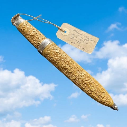 Skaftet er laget av utsøkt kristtorn og på toppen av skaftet er en mutter som er skrudd på tangen som holder bladet på plass. Holkene er laget og hånd-gravert i 925 sølv og stemplet T.N. Slira er dypt skåret og pautet med akantus-mønster.