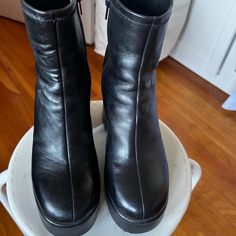Skoletter/boots/ankelstøvletter i brunt skinn selges. Flotte detaljer og spiss tupp. Noen bruksmerker (se bilder). Det er sprekk i sålene (se siste bilde), og de selges derfor veldig rimelig. Minner om sko fra blant annet Other Stories (se bilde)
