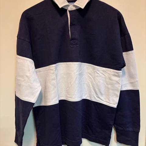 Blå genser med hvit krage fra HM selges kr. 50,-