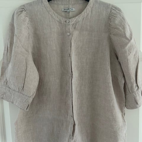 Beige bluse med 1/2 lengde erme. Knapper ned venstre side. Blusen er vid og god å ha over en kjole eller noe under, alt etter hva foretrekkes.