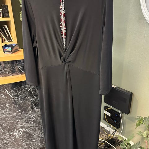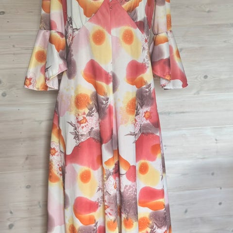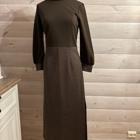 Dansk design og produksjon, REFA Fashion. Står str 44 i den. Strikket rundt livet er tøybart til 104 cm, magebåndet med knappene slik de er nå gir magemål på ca 82 cm, men som det framgår av bilder kan det justeres noen cm. Magebåndet er 87 cm langt, men det er løst så kjolen kan brukes uten båndet. Total lengde på kjolen er 116 cm. Brukt av en person og oppbevart pent, kjolen er fra 80-tallet mener jeg. Se gjerne mine andre annonser, kan samsende