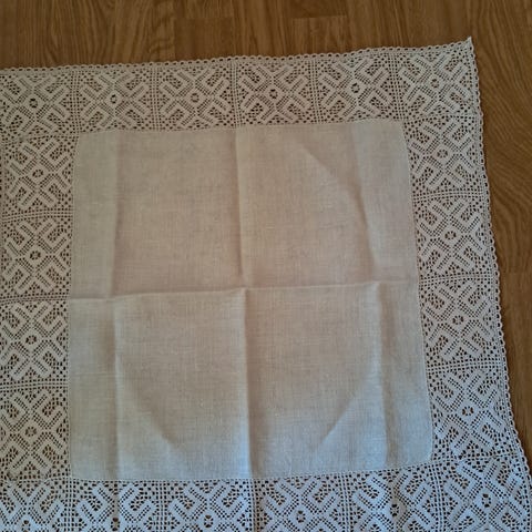 Koselig vintage, håndbrodert løper. Blått på hvitt.