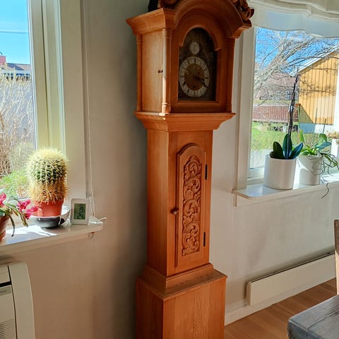 Golvklokke fra 2003 laget av brødrene Bjørndalsæter treskjærerverksted på oppdal,nypris i 2003 ,24000,- ,ca 210 cm h,kan fint males ,urverk er helt fint , lodddrevet .med pendel.flott på hytta..99584193n