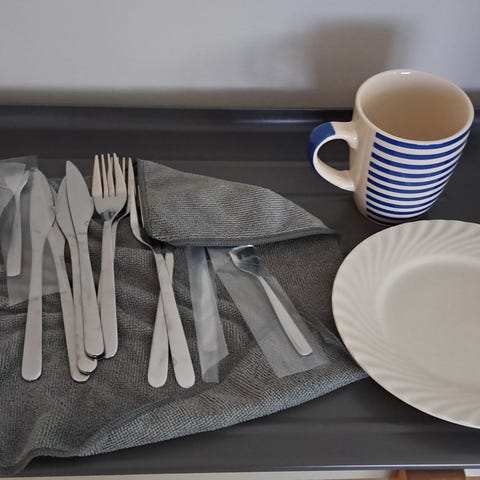 Hele og fine IKEA skåler, frokosttallerkener og tallerkener i vårgrønn/hvit og marineblå farge.