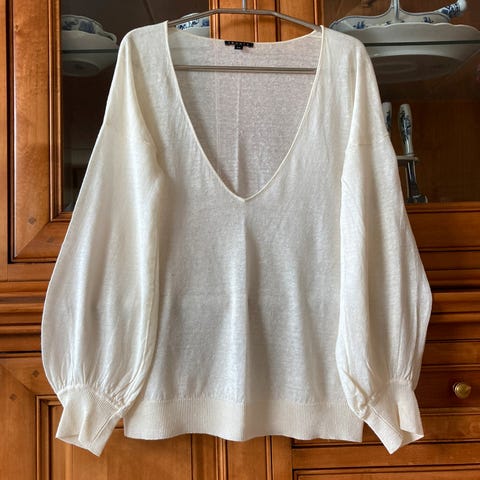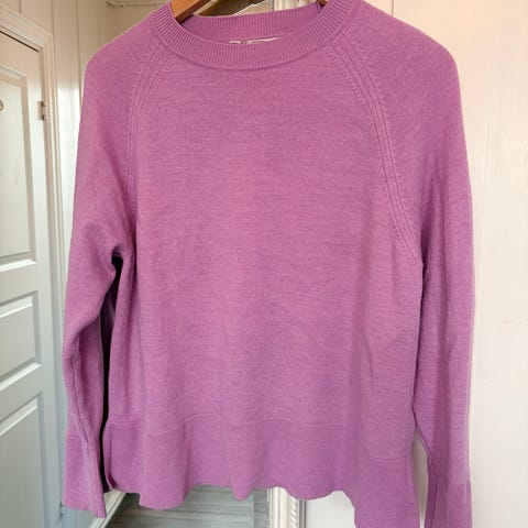 Nydelig Theory genser i varm rosa farge. Fine detaljer med splitter i erme og nederst i sidesømmer i bolen. Kvalitet:Silke/bomull med elastikk, se produktlapp. Genseren er lite brukt og fremstår som ny. Størrelse S. Ganske vid i modellen og vil passe S/M.