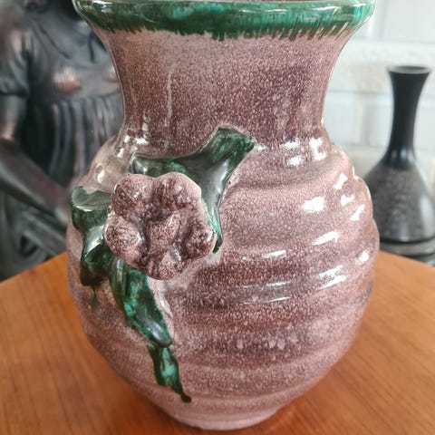 Nydelig vase med taggete mønster påsatt små blå og rosa kuler. Urolig effektfullt da blåfargen har rent ned i glasuren. Vasen er feilfri. Høyde ca 11,5 cm, diameter ca 12 cm. Sender gjerne mot dekning av porto.