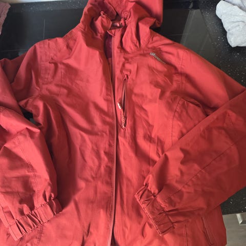 Rosa regnjakke selges for kr 50. Litt slitasje på logoen som det ene bildet viser, ellers i god stand.