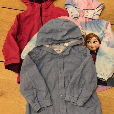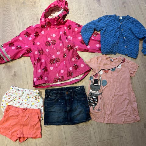 Regnjakke, kjole, nattkjole, 2 luer, shorts (str.98-104).