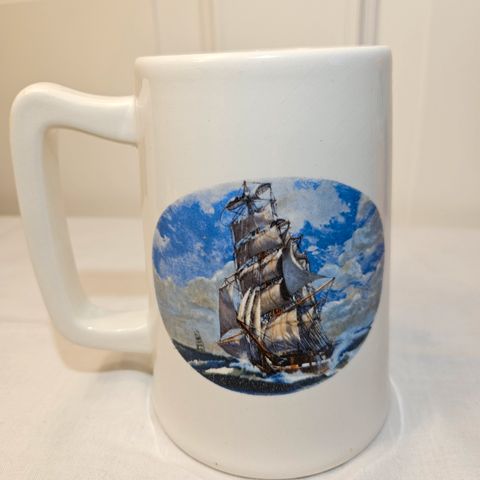 Stort keramikkrus med seilskutemotiv, sannsynligvis solgt som suvenir en gang på 60- eller 70-tallet. Senere har det blitt et samleobjekt men jeg har kun dette ene og selger det derfor til noen som kanskje samler. Eller noen som bare syns det er fint.