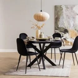 Eksklusivt, rundt spisebord i 40 mm Europeisk heltre eik-langstav, plank med flott bredde. Fasettskåret kant. Leveres med Stjerne X-ben i sort, pulverlakkert-søm-slipt stål som standard.